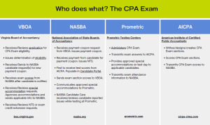 Le processus d'examen CPA est un partenariat entre les conseils comptables des États, l'American Institute of Certified Public Accountants, la National Association of State Boards of Accountancy et Prometric. Consultez ce tableau pour plus de détails.